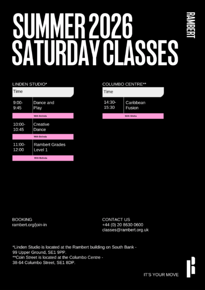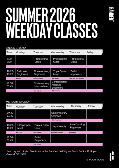 Discover dance classes in London with Rambert and connect with your body, creativity and the joy of movement. Our expert teachers guide students of all levels through a wide range of classes. From Ballet and Contemporary to Line Dance, K-Pop and Gaga, our classes offer a range of ways to move, explore and connect.